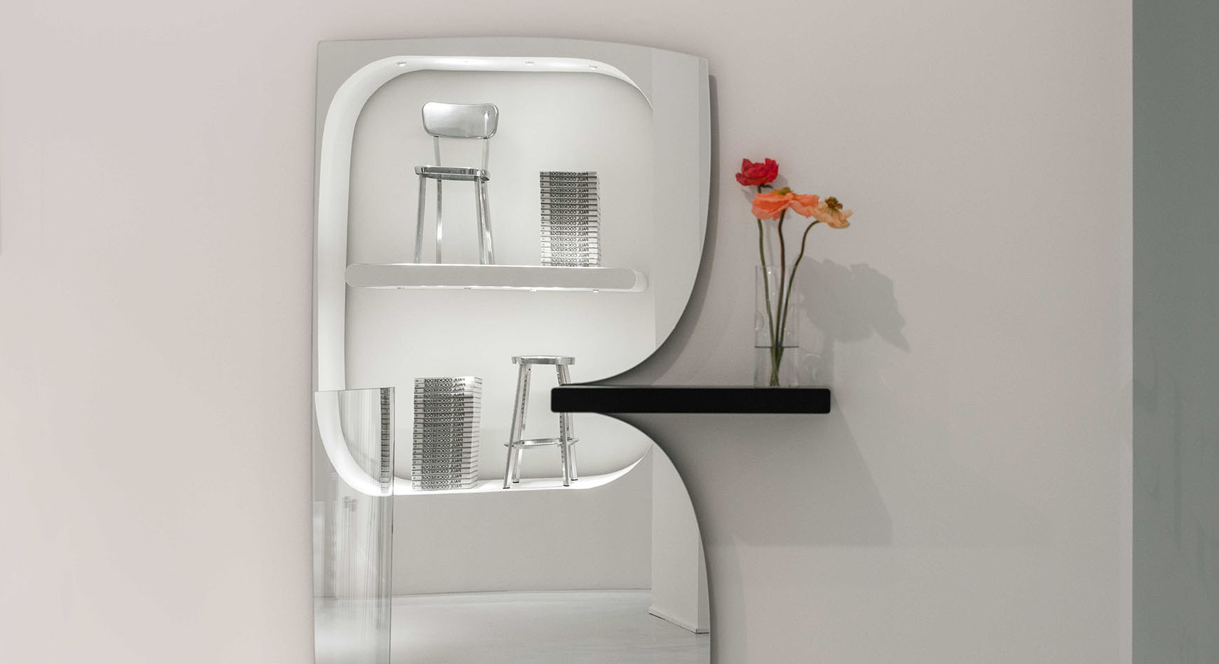 Glas Italia“Marlene” 連載|アートとしてのミラー 第7回 どうぞ、この歪曲したミラーの前を歩いてください。 縁の歪曲によって変化する自分の顔を見てみましょう。不思議な気持ちにな